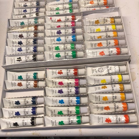 Unikt retro fargeskrin som skyves ut over i nivåer med lokk. Godt brukt. Med fargestifter inni, se bilde.