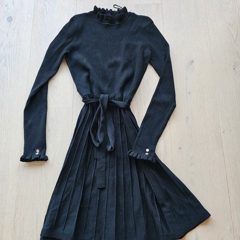 Elegant svart kjole fra Holly & Whyte i str. S. Høy hals og knytebelte i livet som gir en flatterende passform. Klassisk og tidløs modell som passer både til hverdags og fest. Pent brukt.