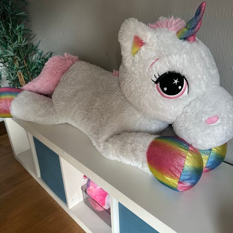 Selger min gigantiske store bamse da den kunn har sittet på sofaen uten å bli brukt. Bamse er en stor og søt kosebamse laget av myk, brun plysj. Bamsen har sorte knappeøyne, en mørkebrun nese og en dekorativ rød sløyfe i halsen.