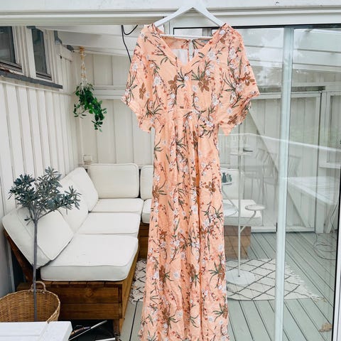 Kjolen, fra Sean Paul, er i str XS. Den har glidelås bak og knapper i nakken. Den er fotsid, uten splitt, og når til gulvet for en som er ca 1.70 høy. Jeg er 1.64, og kan bruke dem med høye heler.