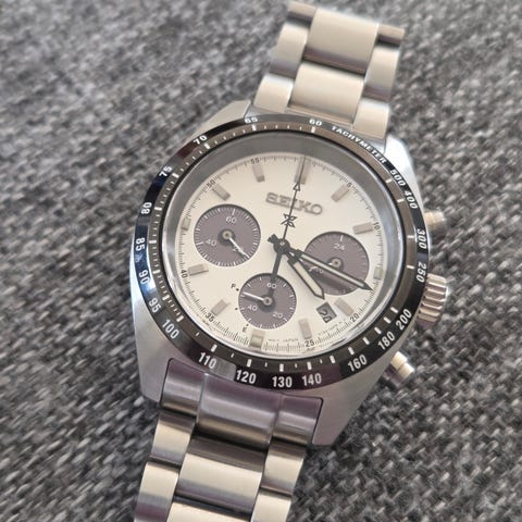 Selger en Seiko SFJ001P fra Prospex-serien – en sporty og presis kronograf med solcellelading og måling ned til hundredels sekund.