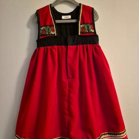 Full lengde 90cm, lengde overdel 20cm, skjørt 70 cm. 32-34 cm i livet og kan justeres inn/legges ut. Denne passer til høyde 115-125cm (ankellang) eller 125-135 (midt på legg). Bunaden kan legges ytterligere opp og ned inntil 10cm for å øke bruksperioden.