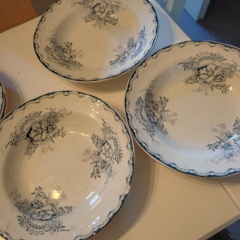 Alle har en svak krakelering. To har et bittelite hakk på siden. Se bilde.