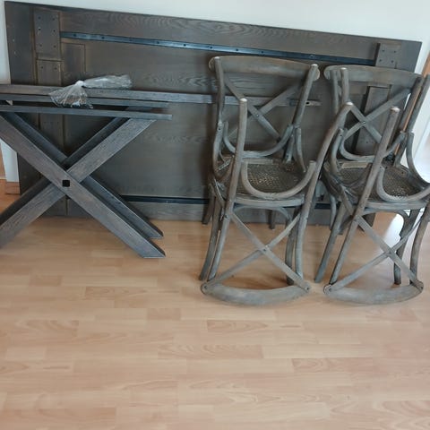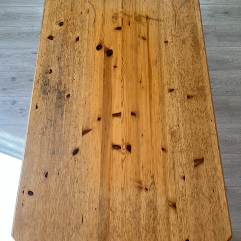 Nydeliig patina, nylig oljet inn. Ett rundt bord som selges med tungt hjerte. Hvite ben og drivved bordplate. Tungt, massivt og solid. Kan fungere som en skjenk, eller brukes som en halv- eller hel måne. Rundt bord fult av sjarm, perfekt for de som trenger å spare plass, eller har en liten leilighet. En liten trebit mangler, men er uten betydning for bruk og gir bare ekstra sjarm.