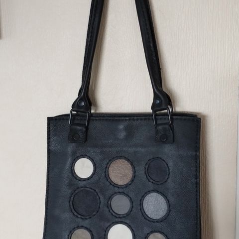 Veske med mange lommer og skulderrem. Ekte skinn, og den har en fin brunfarge. 26/29 cm