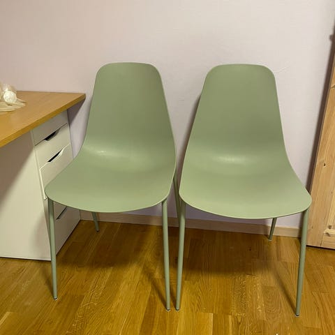 4 stoler i metall/aluminium. Grønn/mørk turkis. Pent brukt, få bruksmerker. Kan brukes både inne og ute. 200 pr stk.