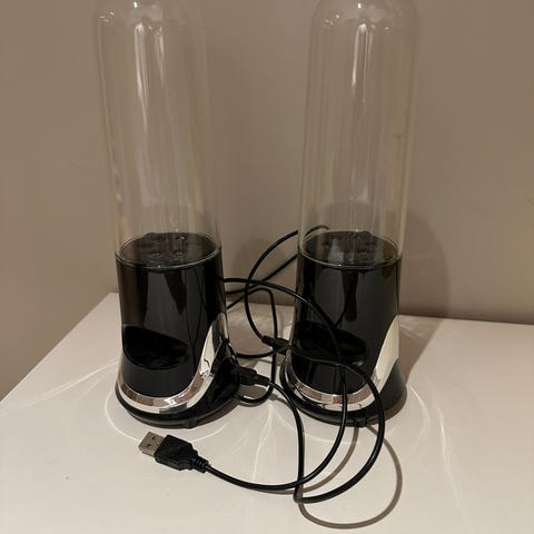 To Bluetooth-høyttalere med effektfulle lysfontener som pulserer i takt med musikken.
