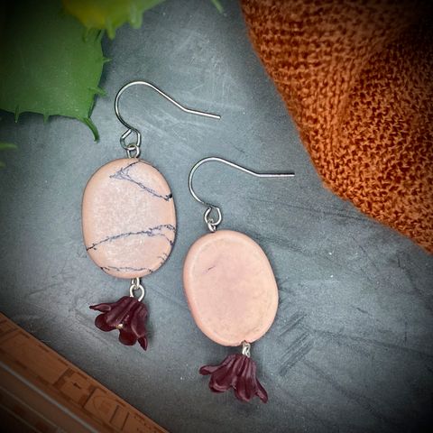 Fine hjerteformede øredobber med sennepsgul emalje og rødbrune glassperler. Usikker på hvilket metall som er brukt, men ikke sølv. Øredobbene er lette.