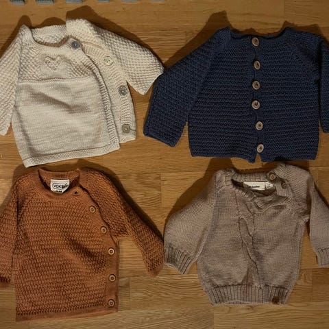 To cardigan i baby til 68. Selger flere babyklær og klespakker til baby, se mine annonser, kan sendes samlet.