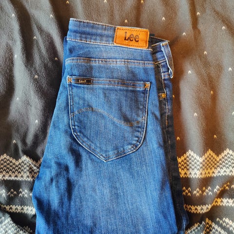 Lee jeans Scarlett. Str 26/33. Noe slitasje. Lite hull ved høyre kne, se bilde.