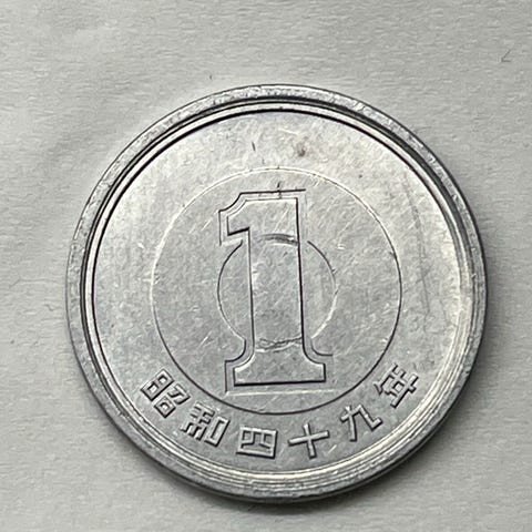 Japansk mynt 1 yen laget av sølvfarget metall. Mynten har en enkel design med tall og japanske tegn. Egnet for samlere eller som en kuriositet.