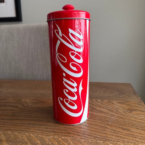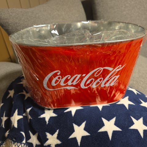 Coca-Cola blikk kurv/kasse med håndtak i sidene.