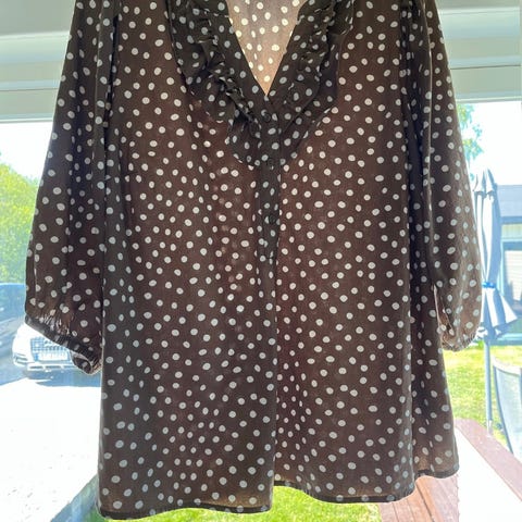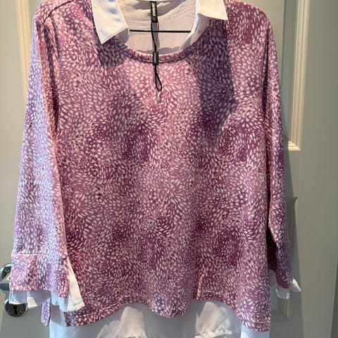 Nydelig lilla og hvit genser med påsydd skjortekrave, skjorteflak og volanger nede på armene. Str L. Meget pent brukt. 130 kr