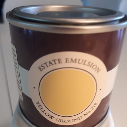 Et halvfullt spann med maling fra Farrow & Ball i fargen Raw Tomatillo. Modern emulsion.