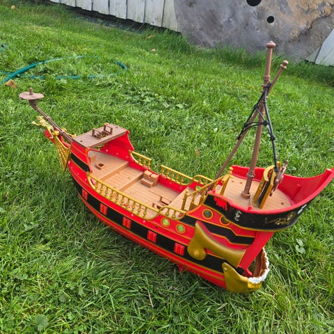 Stor Piratskip Leketøy i rød plast. Dette detaljerte lekeskipet er designet for å gi barn en fantasifull opplevelse med pirattema. Passer for barn som liker å leke med figurer og bygge eventyrhistorier.