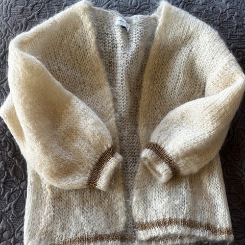 Americandreams cardigan for dame i størrelse S. Fargen er beige/grå, og plagget har et klassisk design med knapper og kabelstrikket mønster. Passer godt til både hverdagsbruk og mer formelle anledninger. Mangler en knapp, men det er ikke av betydning