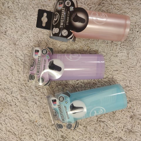 Ene flasken mangler kork, følger med 3 flasker på 220ml og 4 barneskjeer til mat.