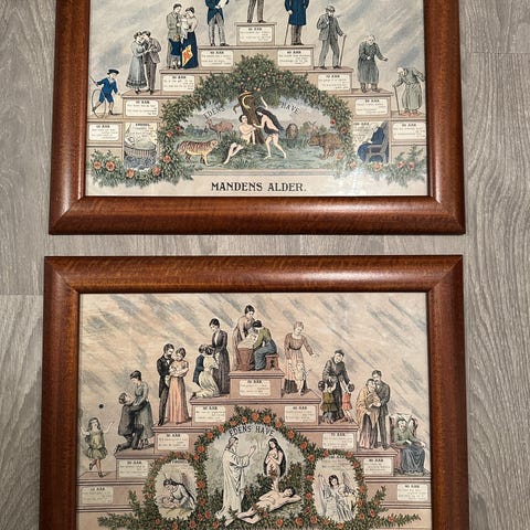 2 originale gamle botaniske bilder fra 60-tallet. Rammemål ca. 31 x 26 cm. Blomstene er montert på gamle botaniske ark med forhåndsprintet tekst. Et bilde med tørket Rome fra Landøy fra 1962 og et bilde med tørket Tysk mure (rettet i teksten) fra Larkollen 1961. Rammene er sølv-farget, og har patina, som enkelte misfarginger og overflateriper enkelte steder, se bilder for stand.
