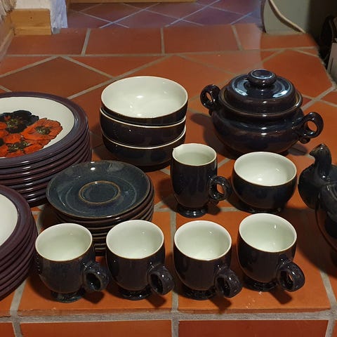 Den ene (se bilde) har litt merker på kanten, men helt brukbar.