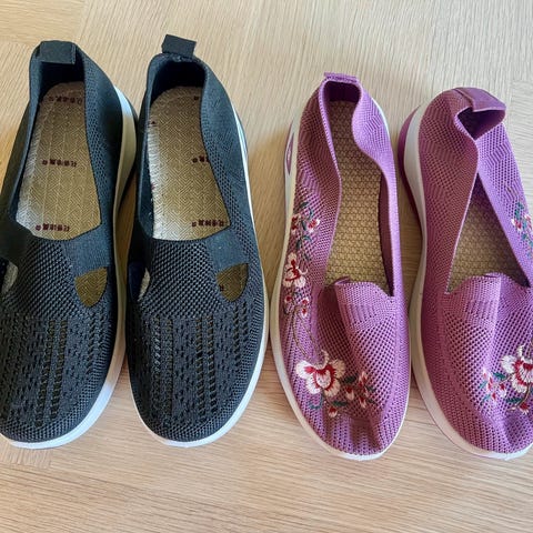 2 par helt nye og ubrukte "sneakers" i str 38 (normal størrelse) i hhv brunt og rosa. Veldig behagelig å ha på, som å gå på en sky, med såle som både støtter og avlaster foten. Lette å ta på, har man smerter (feks ved hallux) er disse en perfekt løsning siden stoffet ikke strammer (som feks skinn gjør), og har en behagelig strech som former seg etter akkuratt din fot.