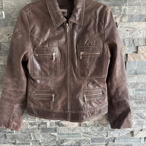Brun skinnjakke selges. Den er hel og pen selv om den er godt brukt.