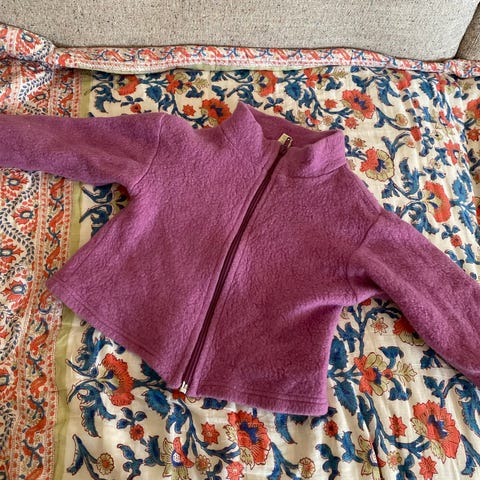Rillestrikket jakke med glidelås fra Nøstebarn. Kjempefin lilla farge 💜 såvidt brukt. Aldri vasket. Størrelse 74/80 (stor i strl. Mer 80/86)