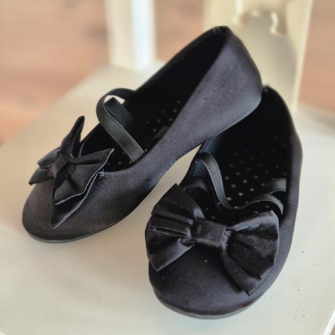Pent brukte ballerinasko i sort imitert skinn selges. Kun brukt i en barnebursdag eller to. Veldig anvendelige sko som passer til det meste.