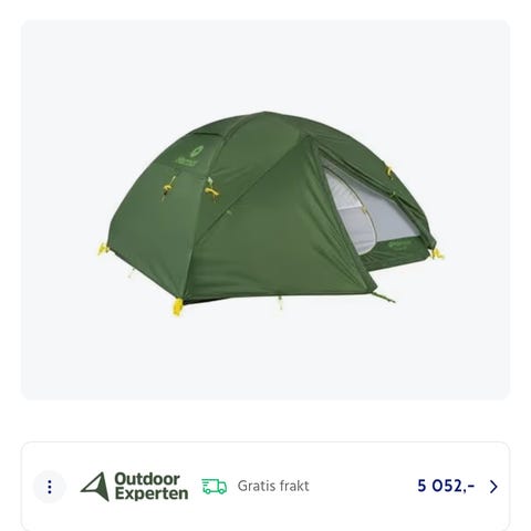 Nypris når jeg kjøpte det var 10999 kr (uten gulvduk) på jaktogfjellsport.no: https://www.jaktogfjellsport.no/products/marmot-tungsten-ultra-light-3p-telt-wasabi