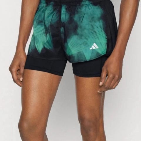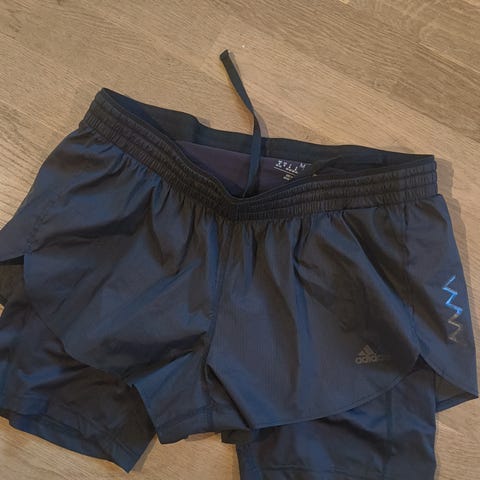 Adidas Adizero shorts for løping i størrelse M. Fargen er blå med et unikt mønsterdesign. Disse shortsene er unisex og passer godt til løpeaktiviteter. Laget av lett og pustende materiale for optimal komfort under trening.