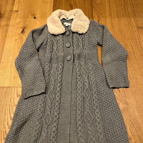 Kul kombinasjon av tykk rosa strikkejakke med tykk mørkegrå vest med prikker.