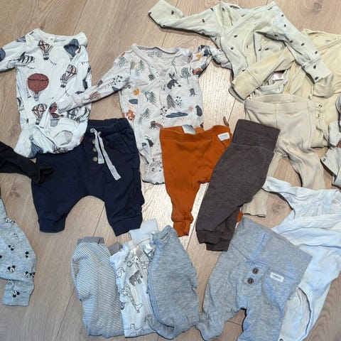 Selger en klespakke i str 56 med totalt 21 plagg. Pent brukt, men mulig det kan være noen få bruksmerker. For det meste Lindex og H&M. Synes bodyene fra H&M er litt mindre enn Lindex sine.