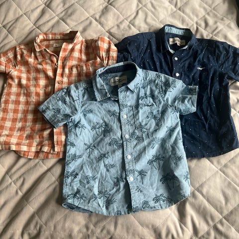 To pene kortermede skjorter fra hhv HM og Hust&Claire, strl 128. En lys, stripet uten krage og en blå med hvite prikker med krage. Hele og pene.