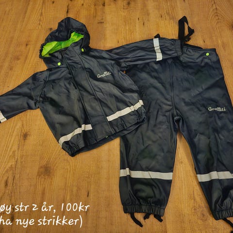 Regnjakke med fleecefôr. Har nokre små svarte strekar på venstre framside. Passar til storleik 92–98.