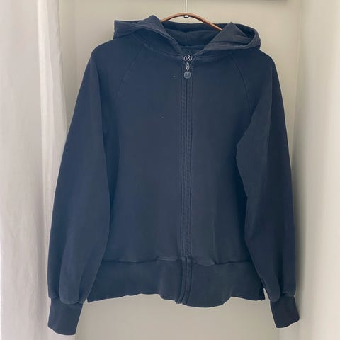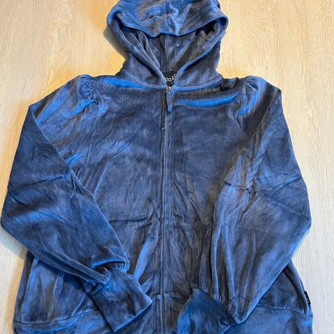 Mørk blå hettejakke med liten puff på ermene fra Ella & Il i størrelse S. Nyvasket og ingen bruksmerker såvidt jeg kan se. Litt liten i størrelsen.