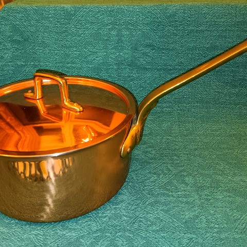 Meget pen fiskepanne i kobber, med eloksert innside.
