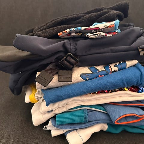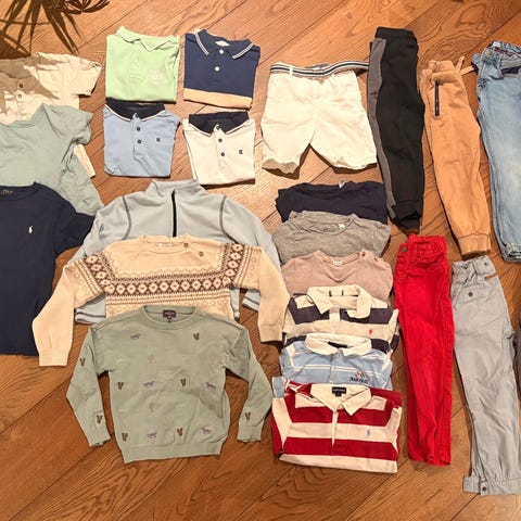 Liten klespakke med morgenkåpe, overtreksbukse, regnjakke, bukse, genser, shorts og t skjorte.