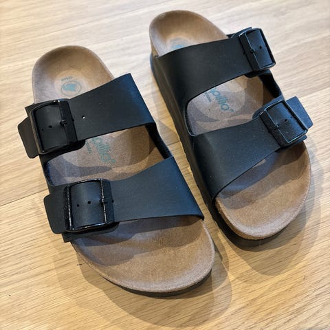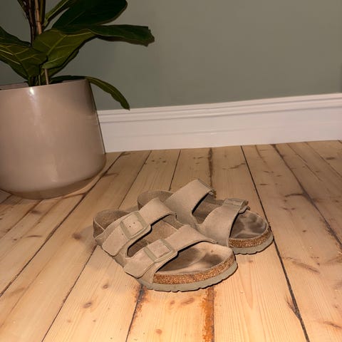 Birkenstock Arizona str 40. Pent brukt, se bilder. Fargen er litt grønn beige. Vegan