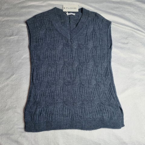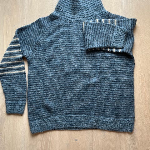 På armene er genseren litt gjennomsiktig med fine detaljer. Blonde kant rundt halsen.