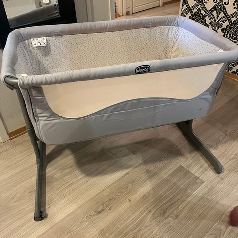 Meget praktisk og reisevennlig Chicco next2me bedside crib som er justerbar i flere høyder og enkelt sammenleggbart.