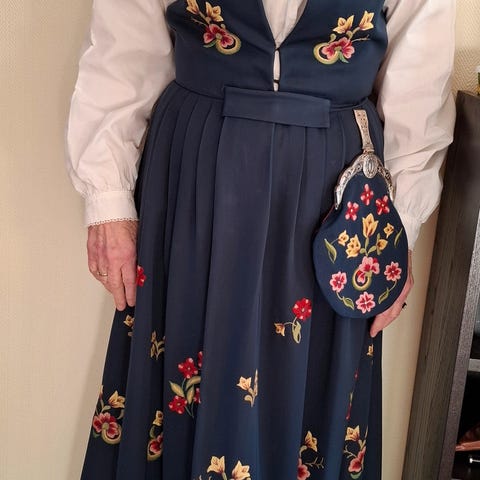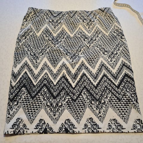Skjørtet er i dongeri. Det er str. 38, er i merket Bershka, og har beltestropper. Sidden er 37 cm målt fra nedenfor linningen. Vesten er i str. S i merket Zara. Den er i polyester og viskose, og er foret.