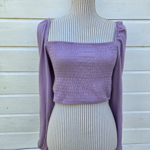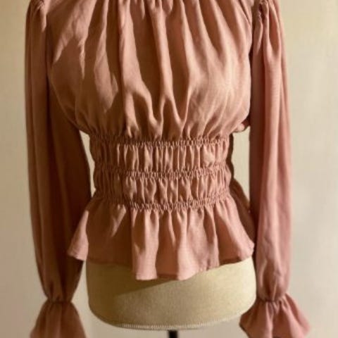 Toppen har lange ermer og en elastisk detalj i midjen og ermene. Passer til hverdagsbruk eller mer formelle anledninger.