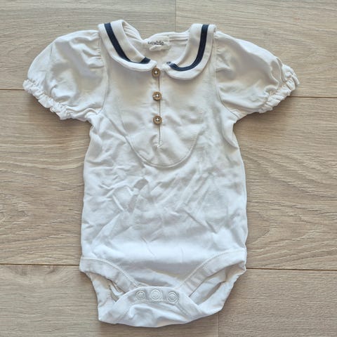 Body med krage i str. 50 og romper i str. 56, begge deler fra Nameit. Body har raknet litt ved søm bak- kan lett sys. Ellers helt og pent uten anmerkninger.