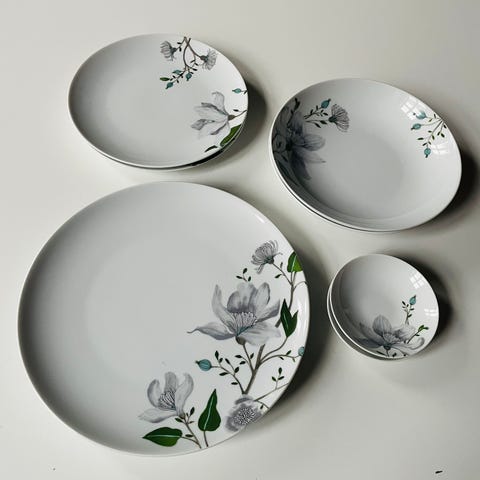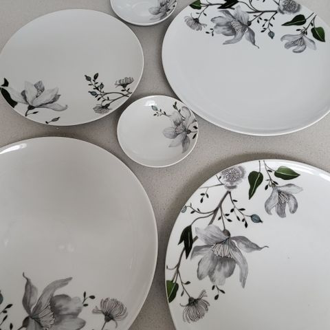 Elegant servise fra Firkløveren / Vallila Interior, serien Clematis. Finsk design med vakre blomster- og naturmotiver i gråtoner, grønt og blått.