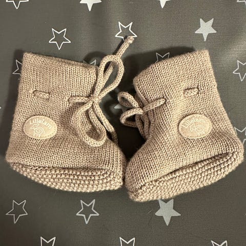 Pent brukte små ulltøfler fra merket Lille Lam. Tøflene er laget av 100 % merinoull. Kan vaskes i maskin.