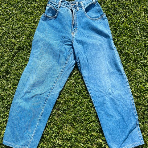 Str. XS, men tilsvarer str. S/M. Smal i midja ellers vid i bena. Hel og fin. Fra 90-tallet.