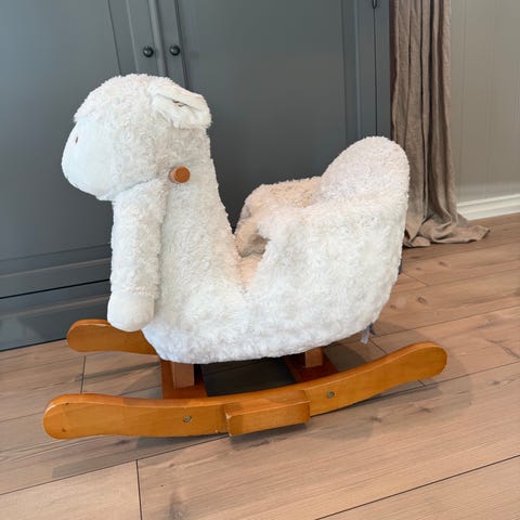 En fin, myk, god og solid gynge sau / gyngestol dyr med rygg og med ett belte sån att de minste sitter tryggere😊 vet ikke helt hvilken alder den kan brukes fra og til men jeg har brukt den til minste mann her fra han var 9 mnd og broren hans som da var 3 år passa fint i den når han prøvde den, den kan nokk brukes fra barnet kan sitte ordentlig selv og har fått litt kontroll på kroppen 😊 den har fått litt nupper, men de kan taes vekk enkelt, ellesj er den hel og fin😊 sjekk gjerne ut mine andre anonser også for fler baby og barne ting 😊