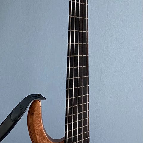 Vurderer å selge min kjære Warwick-bass. Dette er en 2010-modell, bygget i Tyskland. "Natural oil" finish, behandlet med bivoks. Stemmeskruene er byttet med Gotoh-skruer, men ellers er alt av hardware originalt. Den har noe overfladisk slitasje etter 15 år, men er ellers i utmerket stand. Skikkelig lettspilt, slank hals med ekstra lang rekkevidde (24 bånd). Passive humbuckers med coil splitting og aktiv to-bånds EQ gir tilgang til et stort spekter av lyder. Eq-en krever et 9V-batteri, men kan bypasses så man blir aldri tatt på senga av at batteriet svikter midt i en gig. For øyeblikket er bassen strenget med noen eldgamle flatwound-strenger, men gi den et nytt sett med rounds så får den en helt annen, mer moderne karakter.