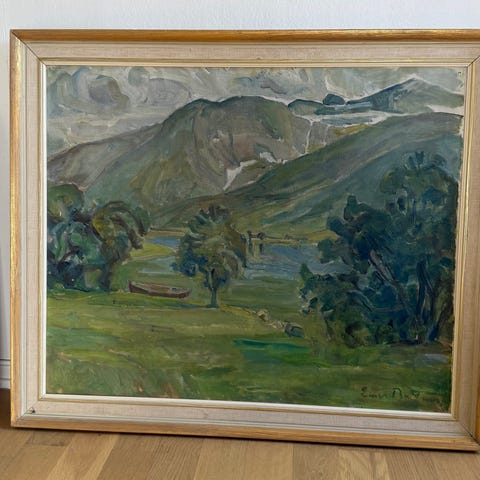 Maleri av landskap, mennesker, hest, utenomjordisk. Fargerikt, grønt, rosa, svart.