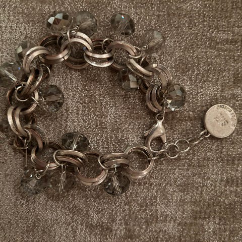 Armbånd med sølvdekor og har store lenker og en dekorativ sølvring. Omkrets ca. 17 cm. med lås.