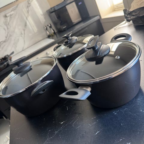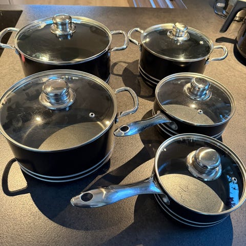 Xanten grytesett. Den største kasserollen er kun kunn brukt en gang. Resten er ikke brukt.